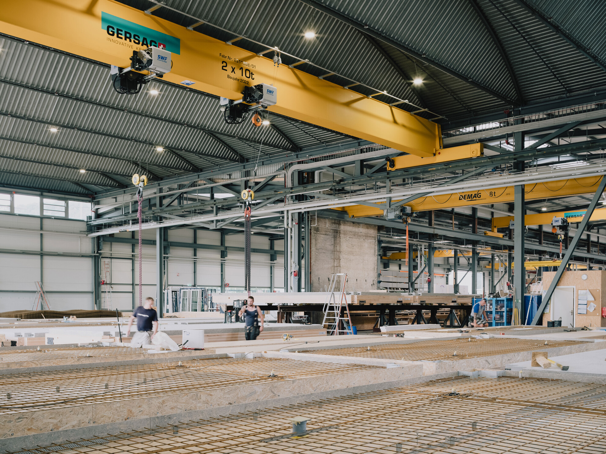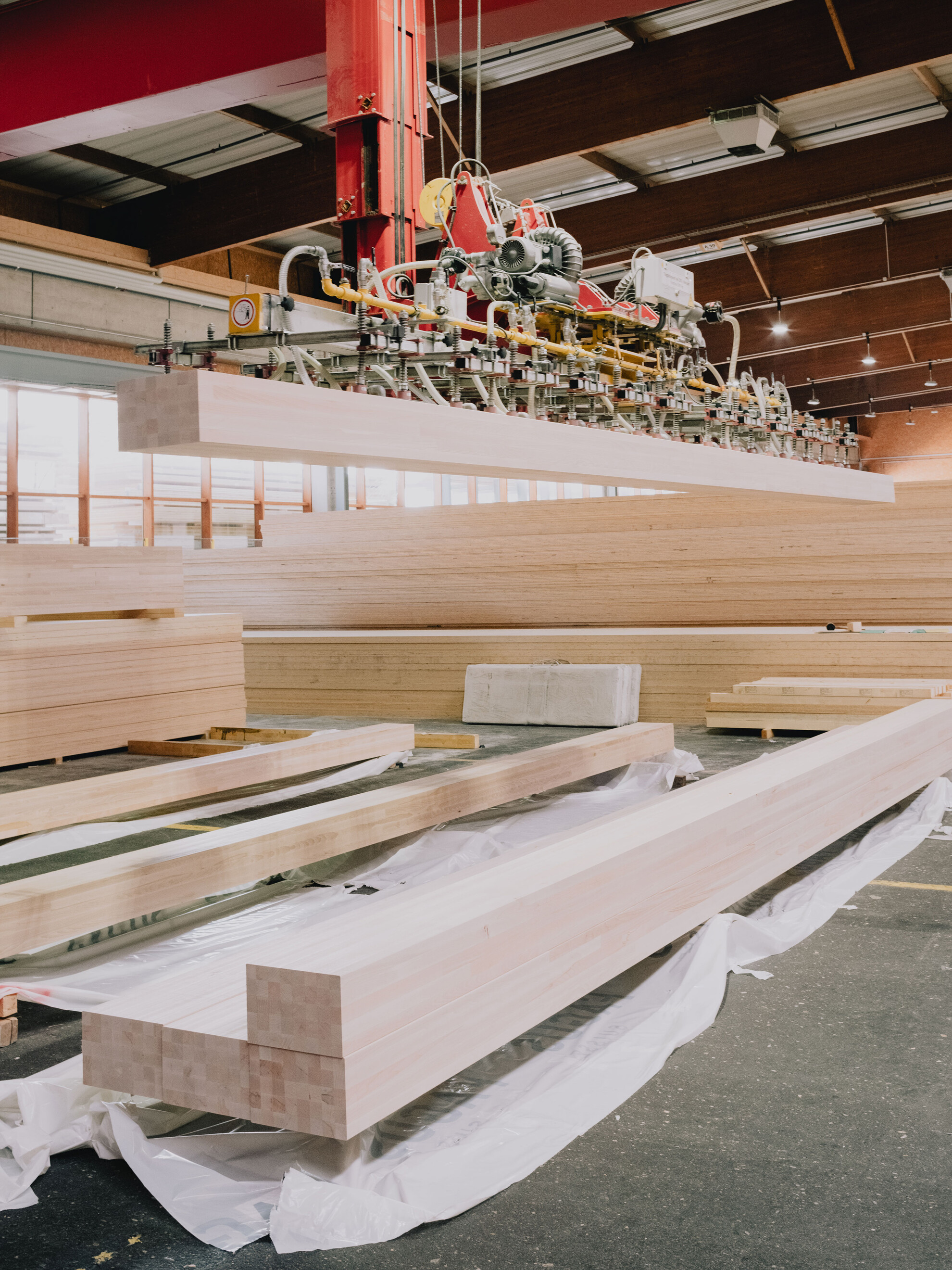 Im Fall des Hochhauses auf dem Zwhatt-Areal ist die lokale Ressource Buchenholz aus Schweizer Wäldern. Bei der Firma Fagus im Jura wurde das nur wenige Kilometer entfernt geschlagene Holz zu Stabholz-Trägern verarbeitet, die später in den Wohnungen prominent in Erscheinung treten werden. Das Verfahren ist eine Schweizer Entwicklung. Statt wie bis anhin üblich aus verleimten Furnieren, bestehen die Holzträger aus Buchenstäben, was rund 80 Prozent weniger Leim benötigt und sich entsprechend positiv auf die CO2-Bilanz der Holzkonstruktion auswirkt.
