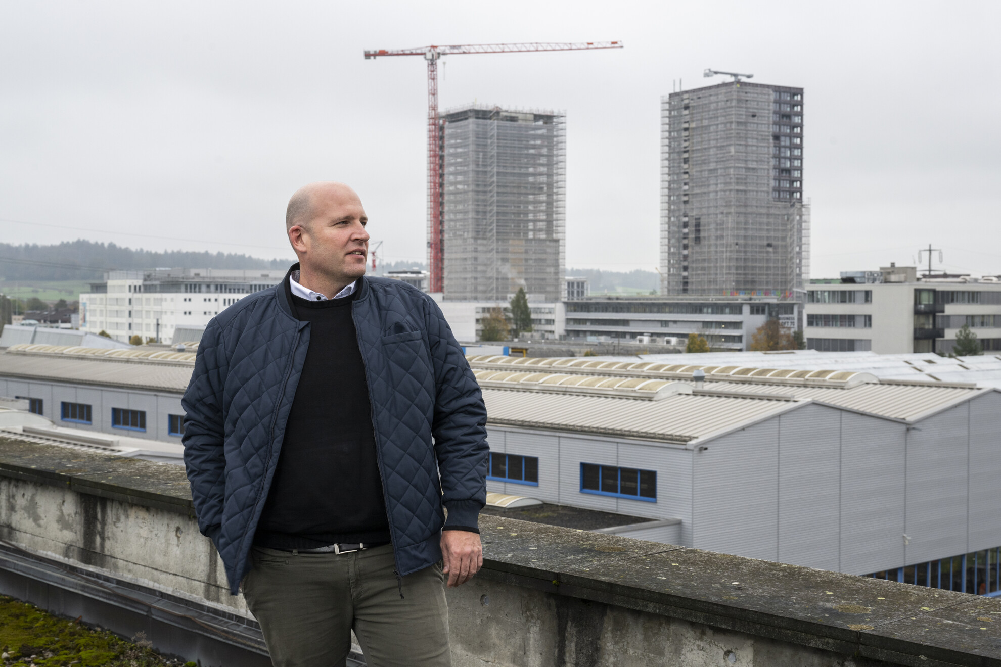 1/3 Hat im Furttal den Überblick: Wirtschaftsförderer Roger Schenk vor den beiden Wohntürmen des Zwhatt-Areals.