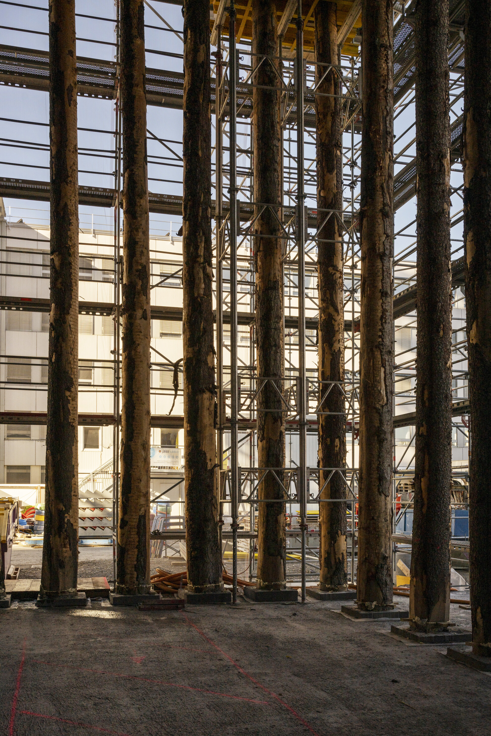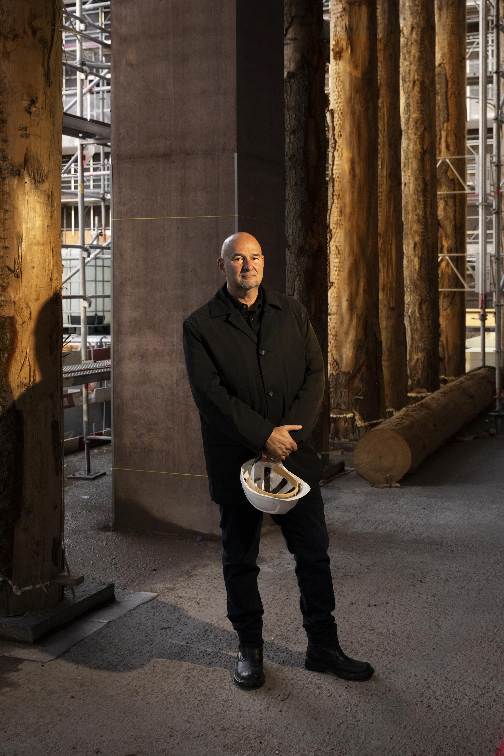 1/3 Holz als tragende Idee: Architekt Roger Boltshauser im Rohbau des Holzhochhauses.
