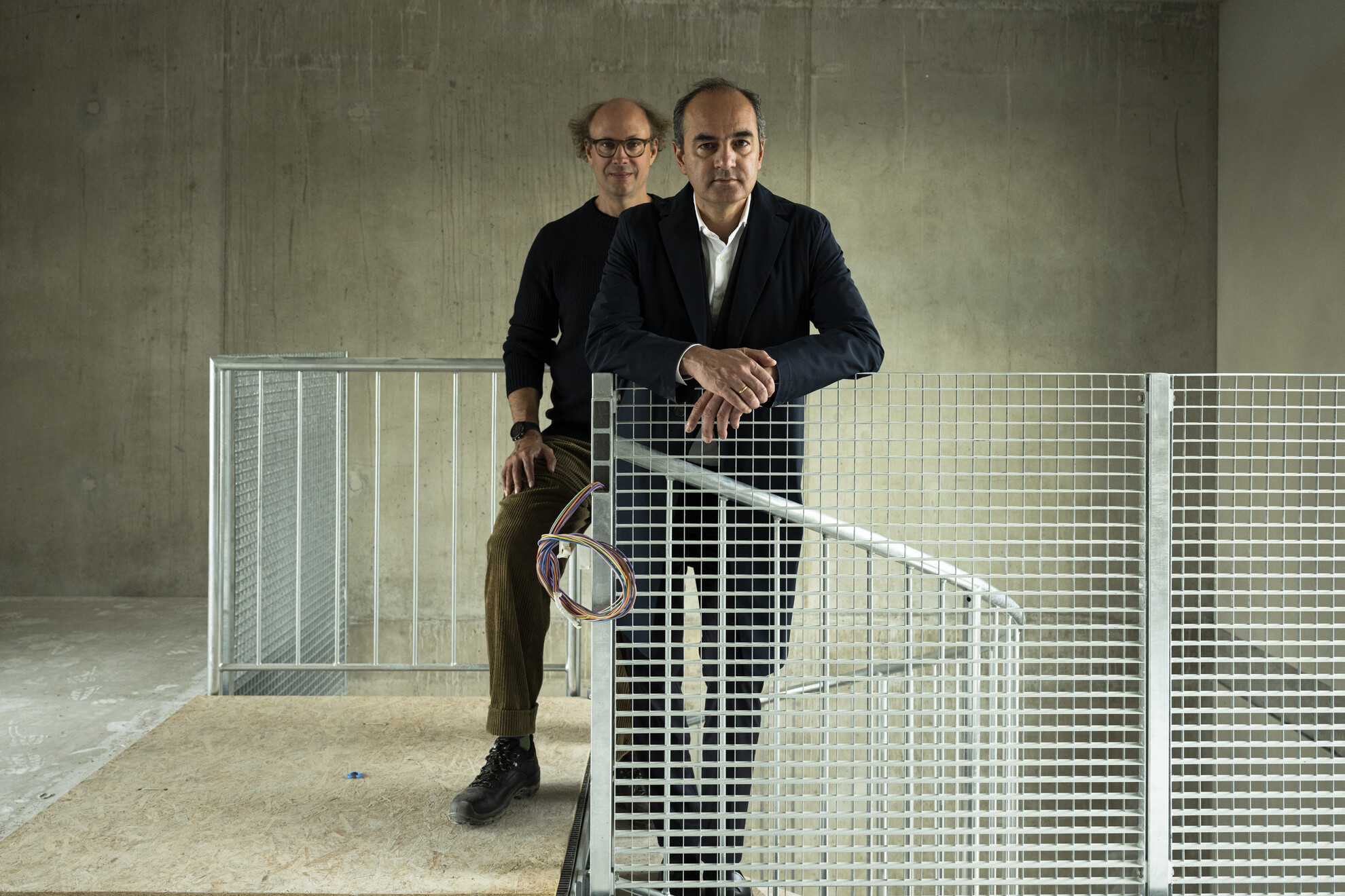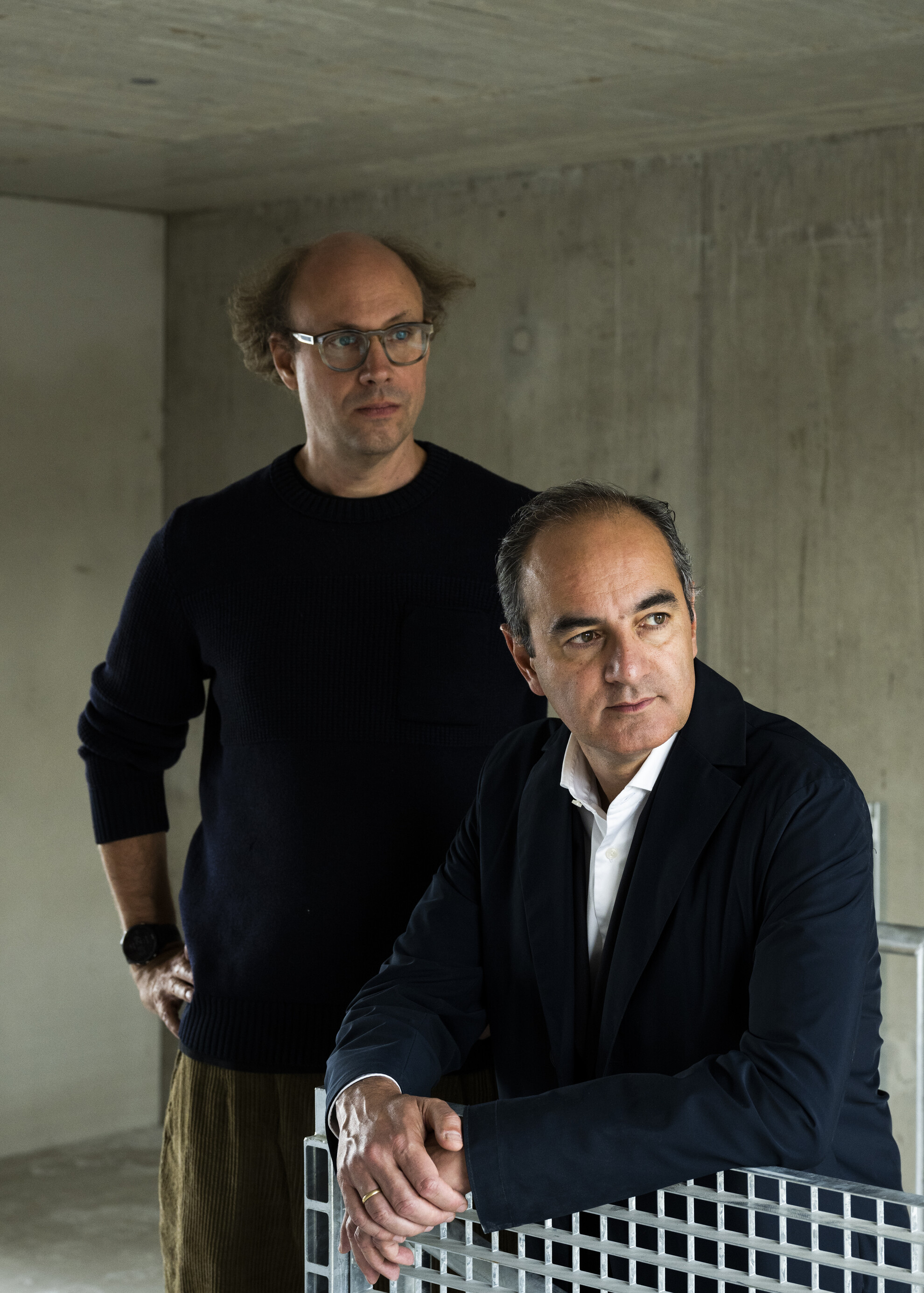 1/3 Das ist «ihr» Längsbau: Die Zürcher Architekten Oliver Lütjens (l.) und Thomas Padmanabhan.
